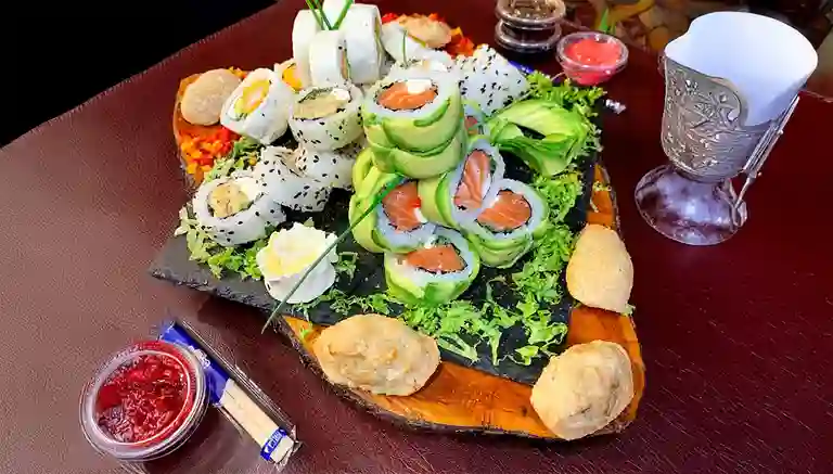 10 Rollos de palta, pulpo furay, 10 rollos de queso crema, salmón furay, 10 rollos fritos de vacuno, queso gauda y 10 rollos fritos, pollo teriyaki.
