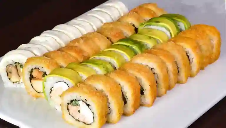 Camarón apanado, kanikama, pepino, zanahoria, palta, queso crema, envuelto en nori, salmón, con salsa acevichada.