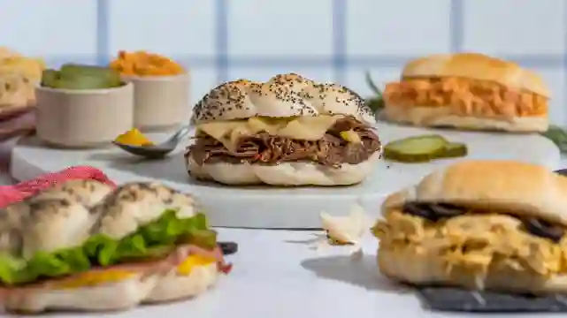 Bagel amapola relleno con pasta de salmón ahumado, queso crema y rúcula.