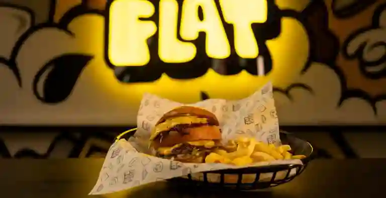 Flat classic : pan suave, carne 120gr y cheddar al centro, más tocino crocante, lechuga, tomate y papas fritas, coronado con salsa fast&flat".