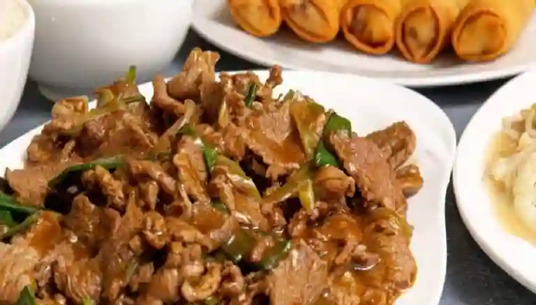 Carne mongoliana, arroz chaufan y porción de papas fritas, para una persona.