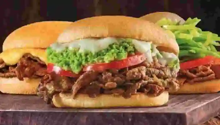 Sándwich con pan de 28 cm, 600 gr de proteina y aderezos a elegir, huevo frito, cebolla caramelizada, queso fundido, acompañado de papas fritas.