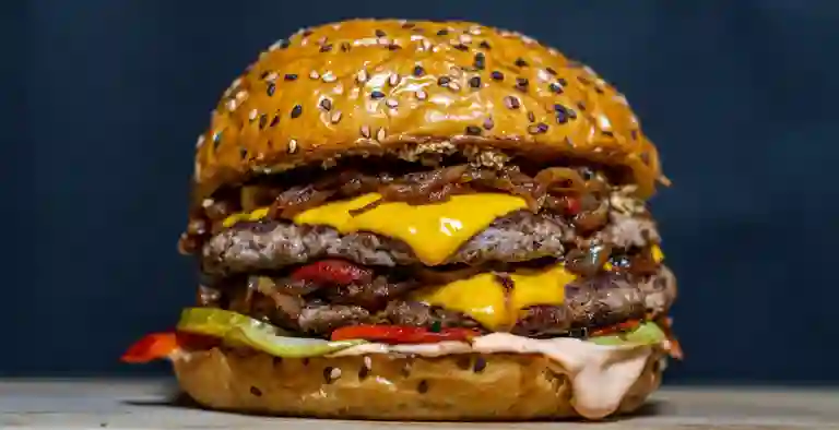 Hamburguesa artesanal, doble queso cheddar, mayonesa casera en pan brioche.