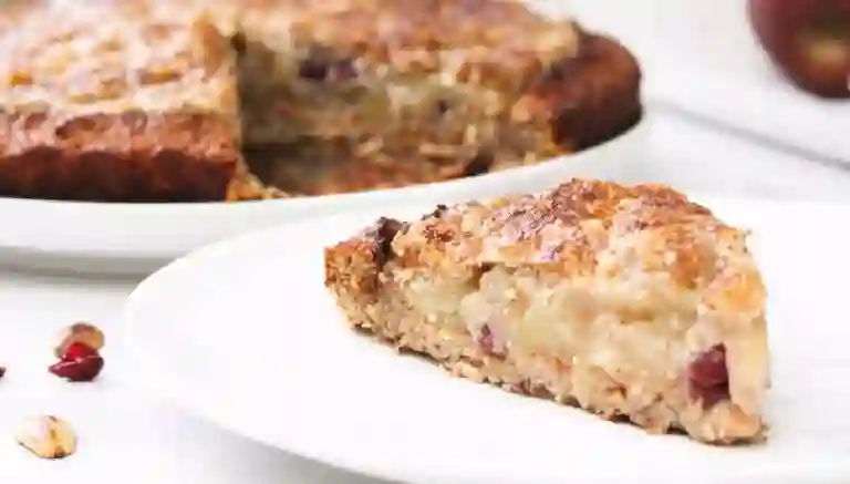 Masa hecha en base a harina de almendras peladas, queso mantecoso sin lactosa, manjar, queso, nuez, huevos y queso crema.