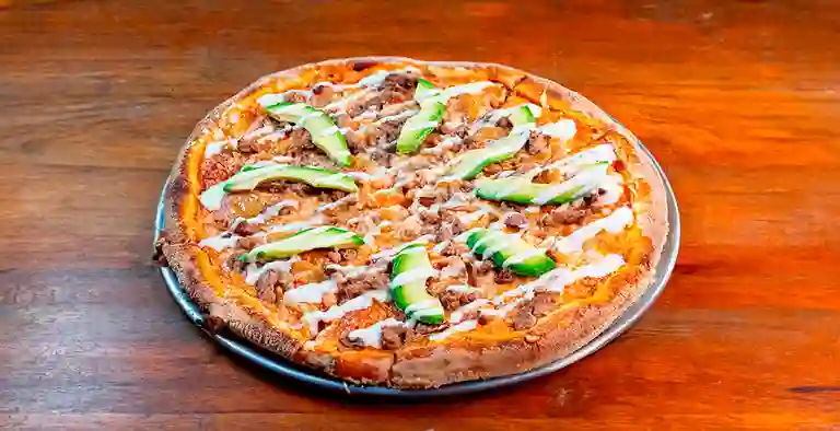 Carne vegetal sazonada estilo mexicano, pimentón tatemado, jalapeño encurtido y un shot de salsa chipotle, sobre base de pomodoro y mozzarella vegana.