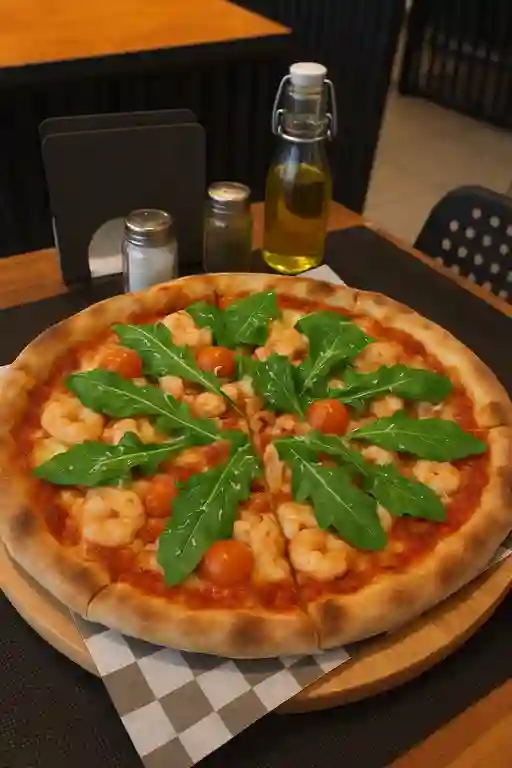 Queso mozzarella, camarones ecuatorianos, tomate cherry, rúcula, shot de aceite de oliva.