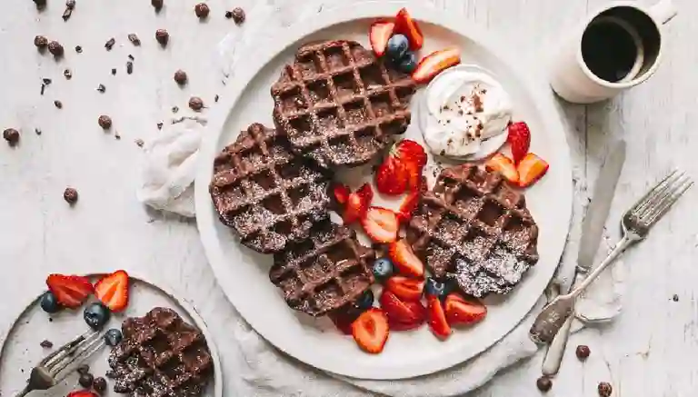 Waffle en forma de taco con base y topping a elegir, crema, fruta de temporada, chocolate derretido.