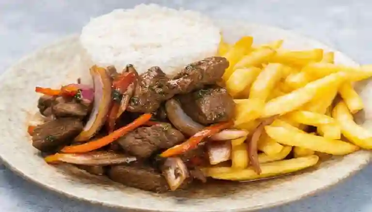 Trozos de Vacuno Salteados en cebolla, Tomate y Salsa de Soya acompañado de arroz y papas fritas.